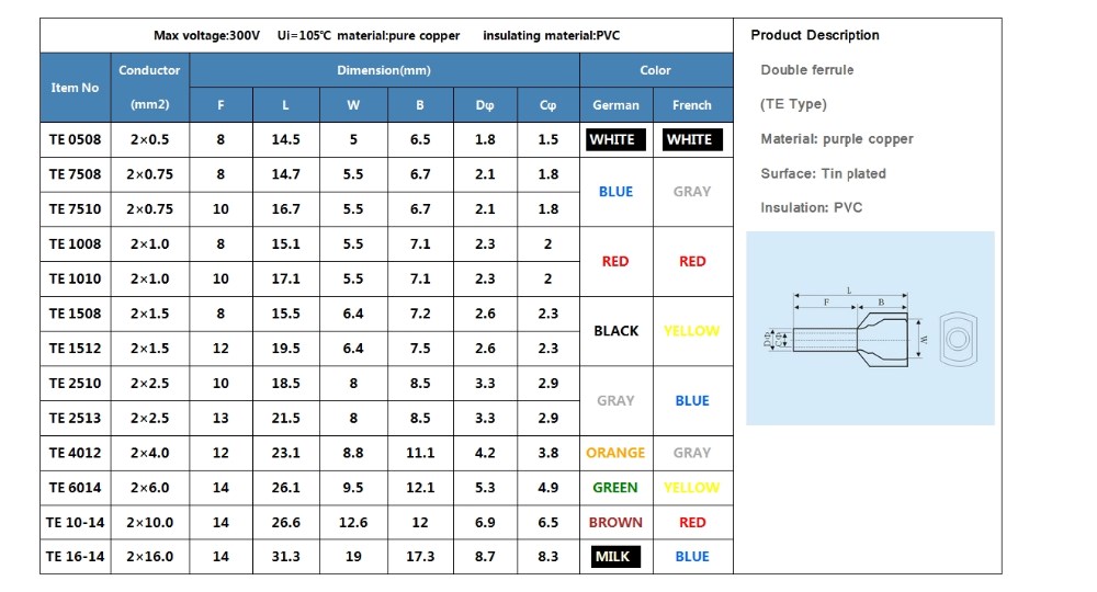 Crewel tube type electrical terminal connector is made by pure copper and insulated by nylon material. Max Voltage achieve to 105 ℃ and 300V.          Used in double cable connecting.